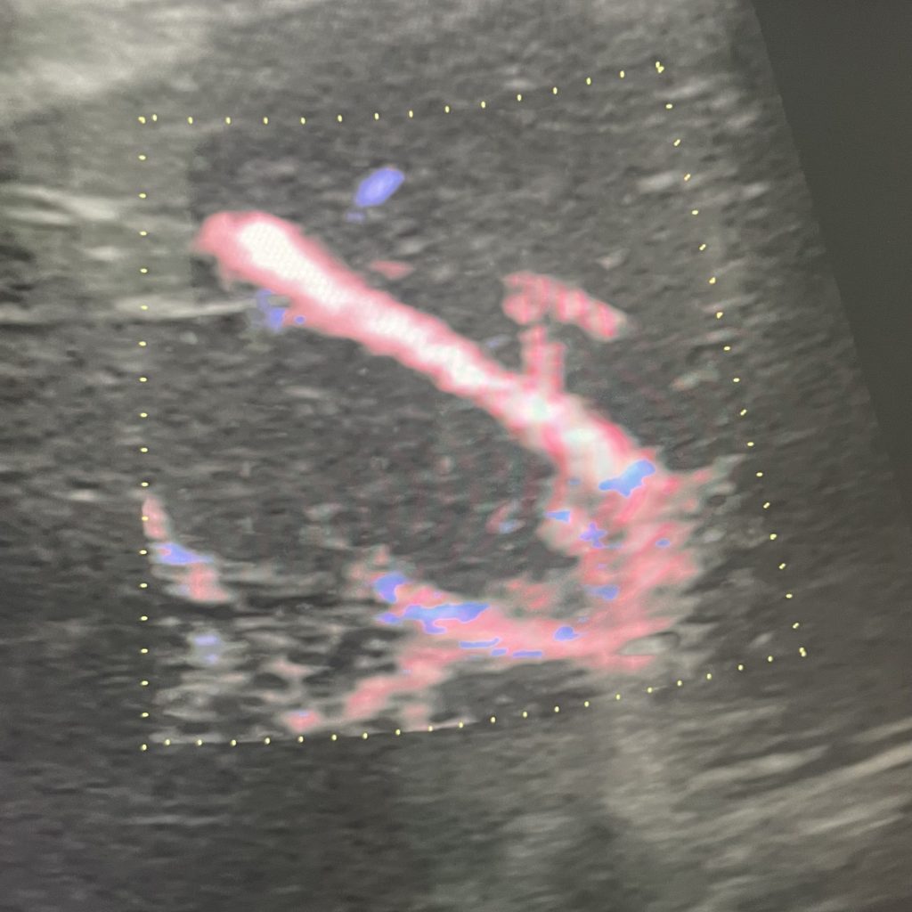 このように赤と青で色がついています。これはしっかり肝静脈に血流があることを示しています。