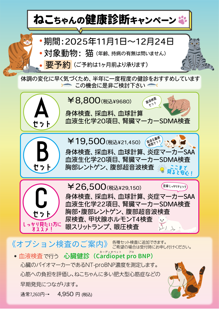11月から猫ちゃんの健康診断キャンペーンが始まります。