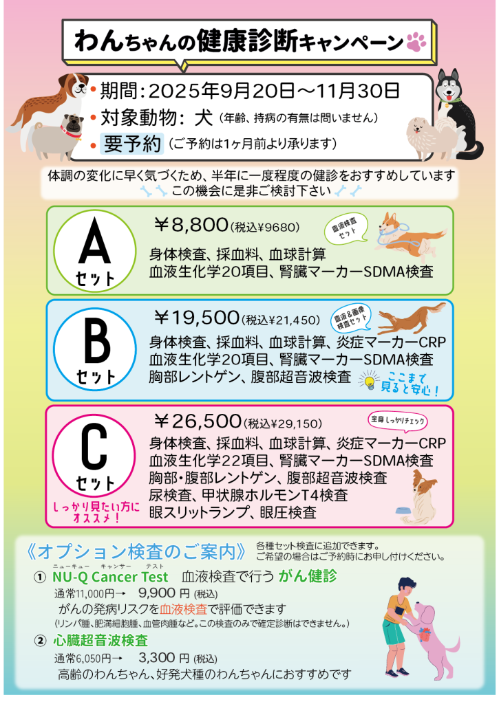 今年も秋のわんちゃんの健康診断のキャンペーンを9月20日〜11月30日まで行います!